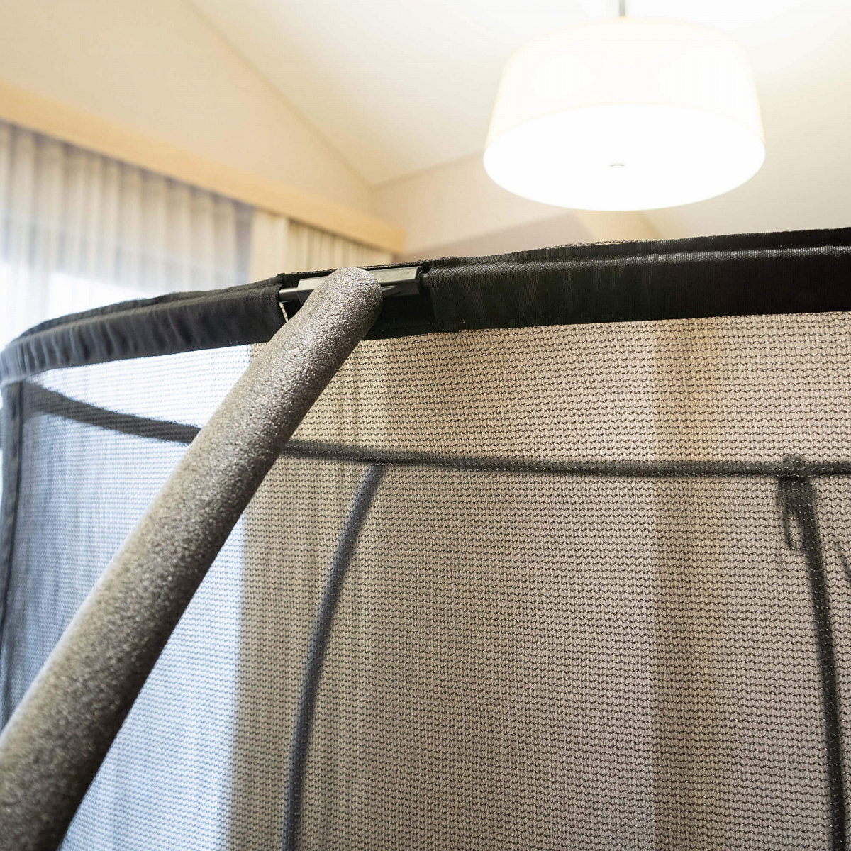 Защитная сетка обеспечивает безопасность ребенка во время прыжков, предотвращает падения. Металлические стойки каркаса покрыты мягким материалом и расположены на расстоянии от прыжкового полотна. Попасть внутрь можно с помощью двустороннего замка-молнии.