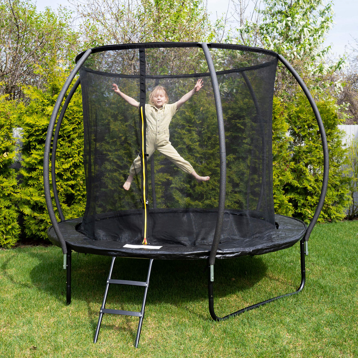 Лестница оборудована пластиковыми ступенями, что предотвращает скольжение. Батут легко собирается и разбирается, что позволяет быстро установить его на дачном участке или игровой детской площадке, делает удобным для хранения и транспортировки.