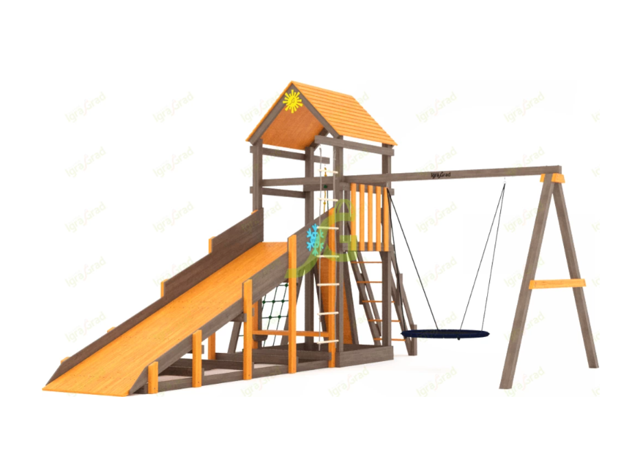 По желанию клиента игровая площадка может быть укомплектована дополнительными элементами. Можно заменить обычные качели на качели-гнездо, которые очень удобны в использовании. Наши специалисты обсудят с вами все детали заказа и быстро оформят заявку.
