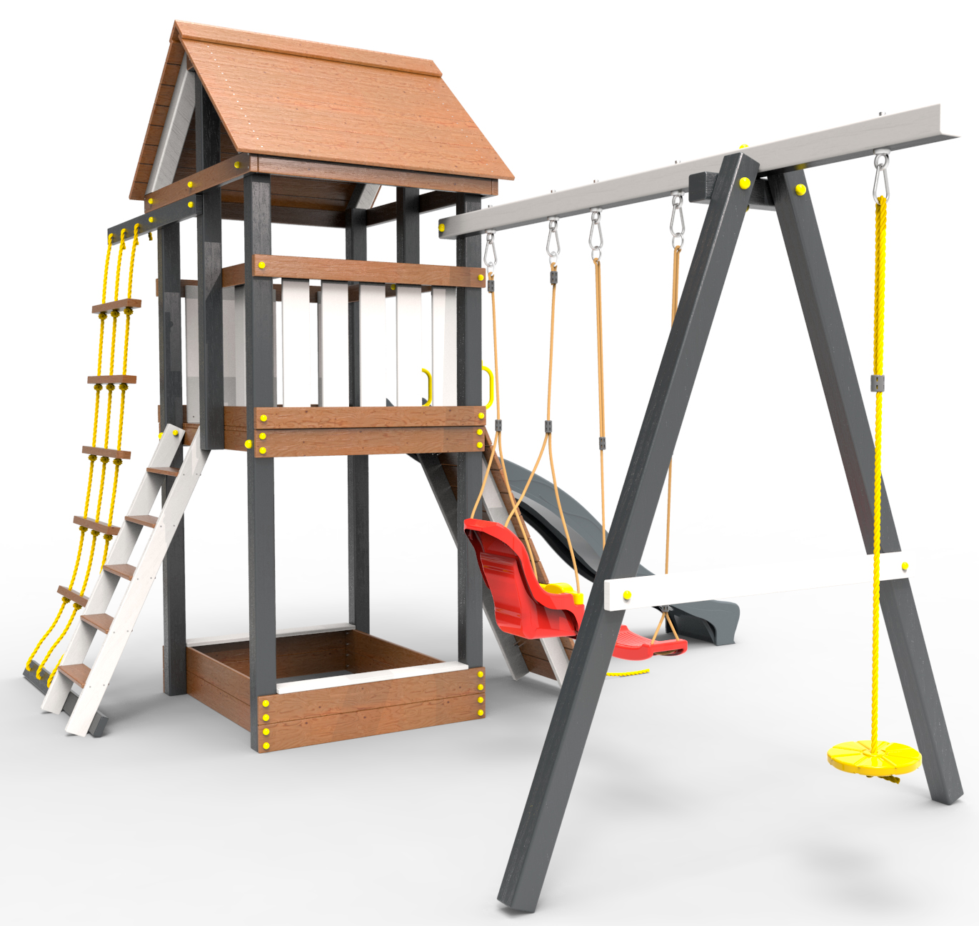 Комплектация модели выполняется по вашему желанию. Древесина пропитана высококачественными экологичными материалами (антисептиками), и покрашена..