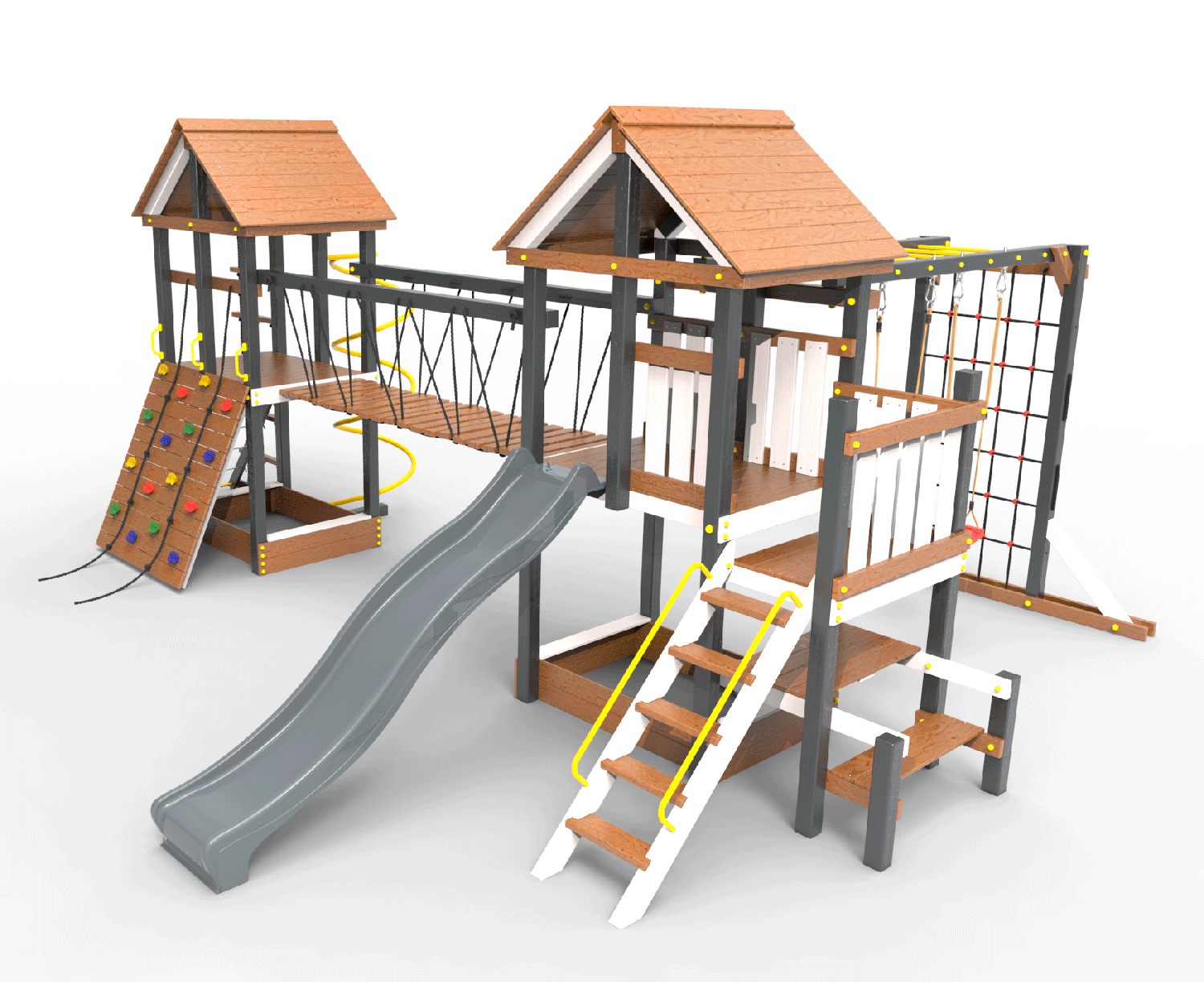 Обращаем Ваше внимание, что фактический цвет детской площадки может отличаться от представленных фото на сайте. Специфика окраски нетоксичными пропитками и красителями допускает отклонения в цветовой гамме отгружаемых изделий. Также обратите внимание, что фактический цвет может отличаться из-за цветопередачи устройства на котором Вы смотрите фото. Производитель оставляет за собой право менять цвет отдельных деталей и комплектующих(включая пластик, канаты и пр.), при этом сохраняя весь функционал и характеристики товара.