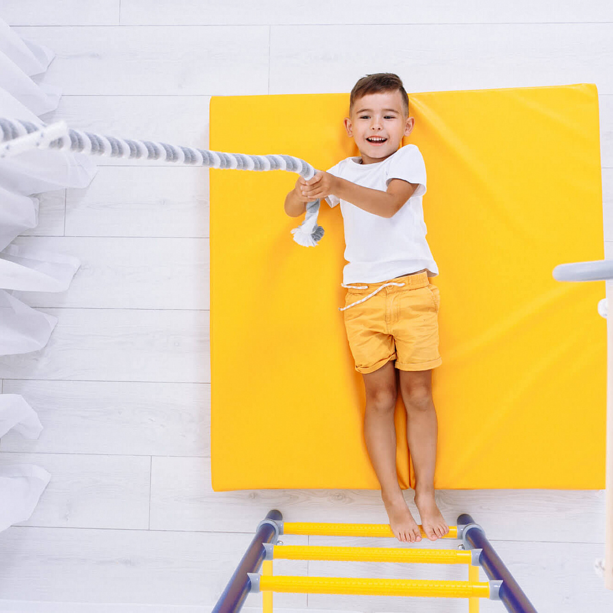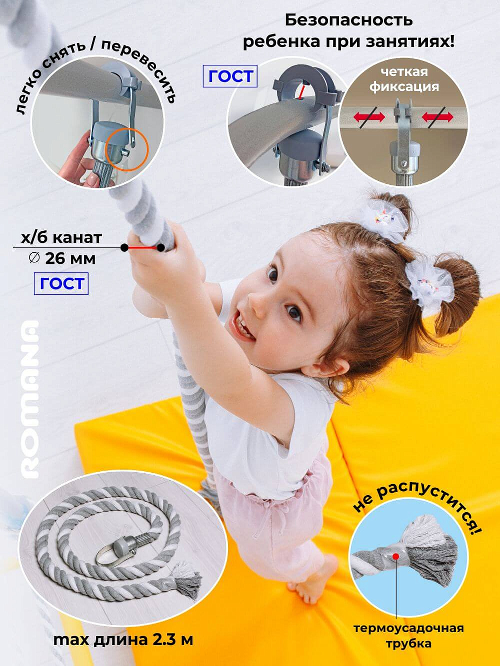 Одно из важных преимуществ этого ДСК - регулируемый турник, который фиксируется надежными хомутами. Его можно установить на лестнице на любую высоту. В зависимости от возраста ребенка, турник можно перевесить повыше или пониже.