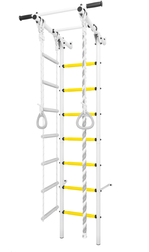 Желтый цвет ступеней гармонично сочетается с белым корпусом, спортивный уголок стильно выглядит в любом интерьере.