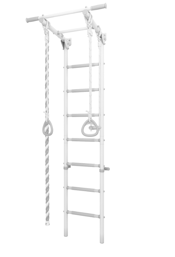 Пастельный цвет ступеней гармонично сочетается с серым корпусом, спортивный уголок стильно выглядит в любом интерьере.