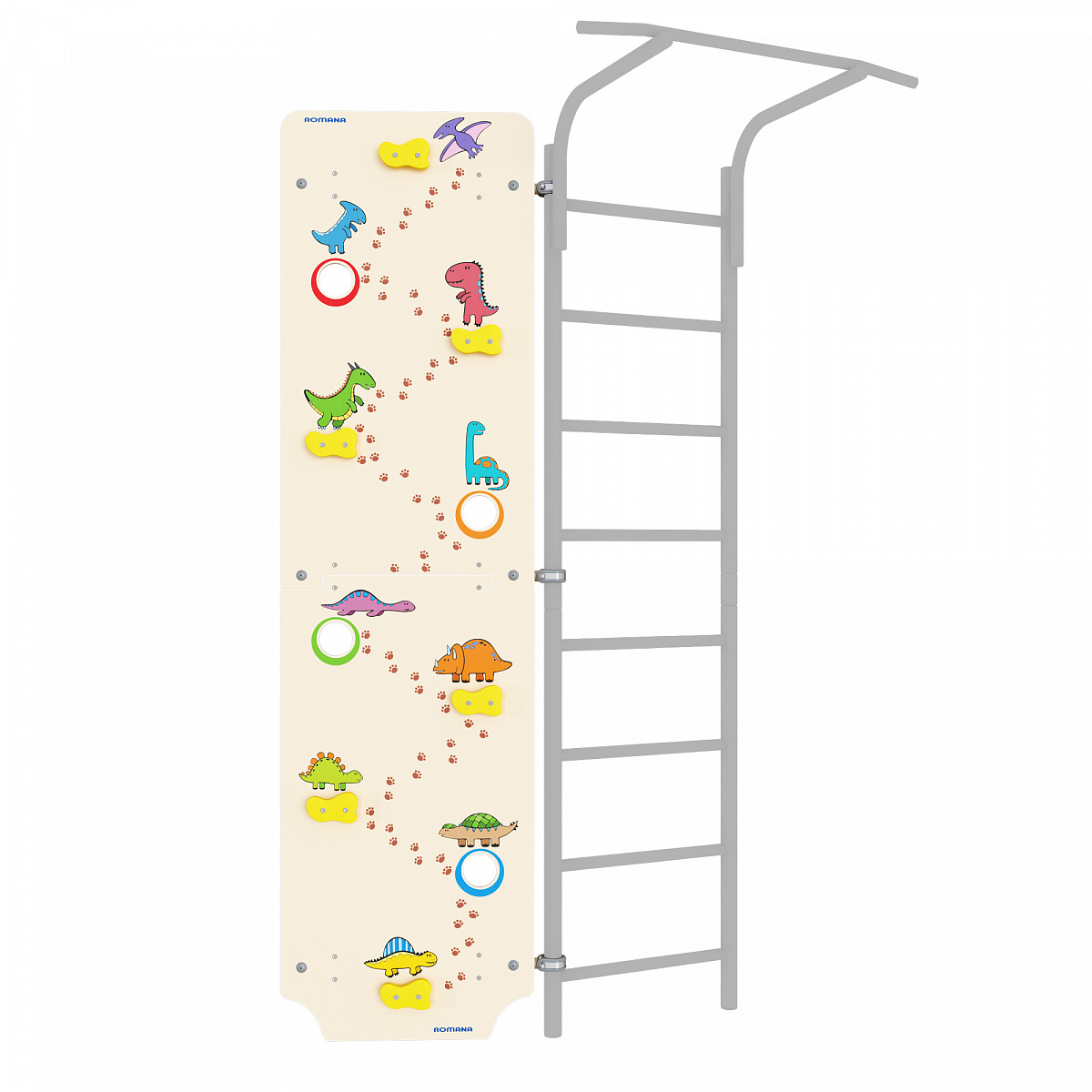 Превосходное решение для тренировки маленьких альпинистов в домашних условиях. Большой фанерный щит крепится либо слева, либо справа от лестницы и позволяет детям тренировать навыки скалолазания в домашних условиях. Все зацепы сделаны согласно технике безопасности. Щит украшен веселыми динозавриками, которые поднимают настроение при занятиях.