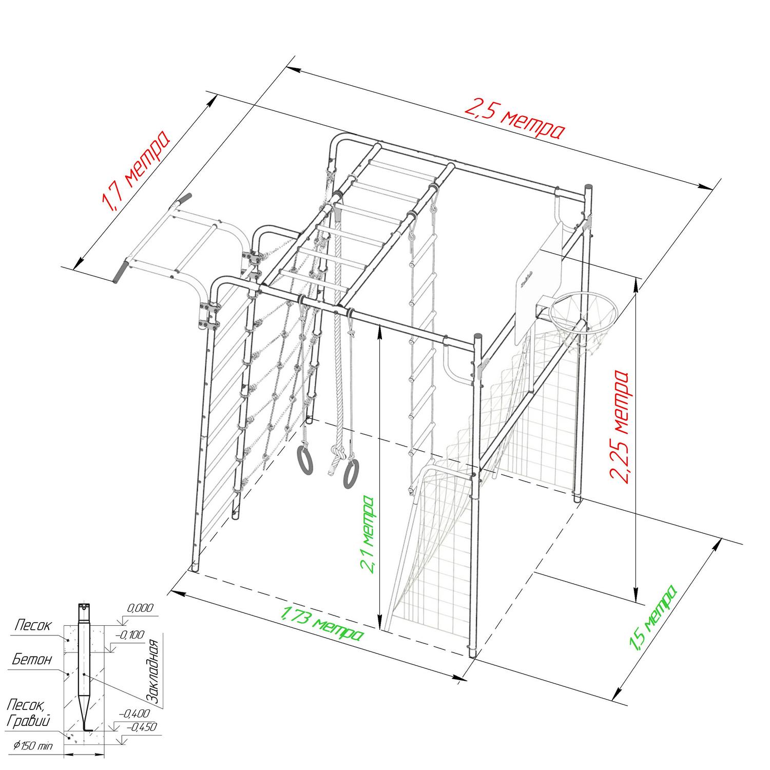Особенности установки конструкции: Закладная деталь представляет собой трубу диаметром 42 мм длинной 450 мм, которая устанавливается в нижние торцы опорных труб, а затем в ямы, вырытые в грунте, глубиной не менее 45 см и бетонируется. При необходимости, например, на зиму, от кражи или вандализма, если дачный участок не посещается длительное время, комплекс может быть легко и быстро демонтирован, а весной установлен на это же место так же легко и быстро.